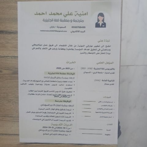 أنا سوداني حاصل على دراسات عليا في اللغة الانجليزية "ماجستير الترجمة" امتلك مهارات التواصل الفعال أتمييز بالمرونة وأتقن فن حل المشكلات وأحمل قيد صحفي وعملت بالصحافة من قبل أرغب في وظيفة مترجم (ترجمة فورية - ترجمة عقود وبنود - ترجمة أوراق وبحوث علمية) أحمل إقامة عمل سارية جاهز للتوظيف ونقل الكفالة فورا حاليا في الدمام وأقبل بالسفر والانتقال الى أي مدينة داخل المملكة