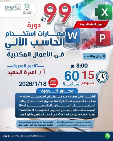 معهد اعمار العالي للتدريب يقدم لكم دورة مهارات استخدام الحاسب الآلي في الأعمال المكتبية أساسيات تحولك من مبتدئ الى محترف في أقل من أسبوعين اليوم كل وظيفة تحتاج مهارات حاسب ومع تطور سوق العمل صار الالمام بالكمبيوتر شرط أساسي، سواء كنت موظف، خريج، أو تبغى تبدأ مشوار مهني جديد ومع دورة اعمار تبدأ بقوة وثقة