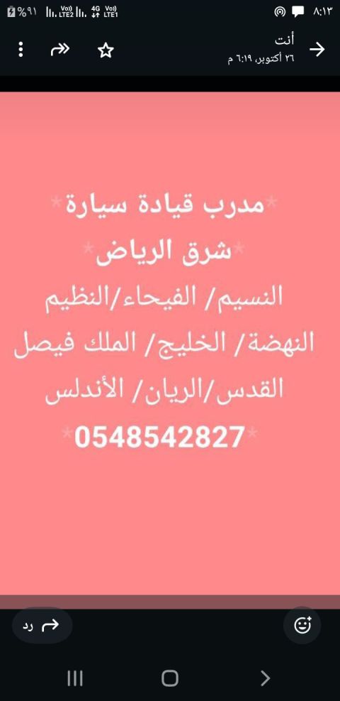 مدرب قيادة (سواقة) تعليم قيادة شرق الرياض خبرة مميزة خطة تدريبية واضحة بأسعار منافسة التدريب لكافة الاعمار التدريب عملي في الأماكن المفتوحة، والمزدحمة القيادة تعليم تطبيقي (أساسيات السيارة - الاشارات المرورية - المسارات - التحكم في الطارة - اليوتيرن - المواقف. الخ تدريب بالكورس وبالساعة