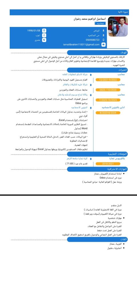 محاسب مصري حاصل على بكالوريوس تجارة خريج عام 2021 جامعة الأزهر 1 - محاسب لدى شركة ابداع مرسوم في تسجيل العمليات المحاسبية باستخدام (ERP) Odoo محاسب لدى شركة اتاسكو للمقاولات العامة القيام بتسجيل القيود اليومية وتسجيل المصروفات والايرادات 2 - محاسب لدى شركة طيبة للتكييف والفلاتر متابعة حسابات العملاء وحسابات الموردين. 3 - الشؤون الاجتماعية متابعة تسجيل بيانات الخاصه بالمستفيدين باستخدام الأكسيل