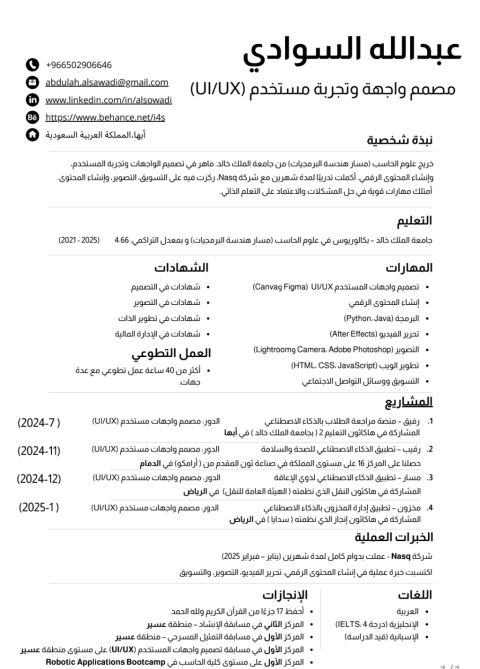 مصمم UI / UX وGraphic Designer يبحث عن فرصة عمل أنا مصمم متخصص في تصميم واجهات وتجربة المستخدم (UI / UX) والتصميم الجرافيكي، وابحث عن فرصة عمل استثمر فيها مهاراتي الابداعية وخبرتي في ابتكار تصاميم حديثة، واضحة، وسهلة الاستخدام. أسعى للانضمام الى فريق مبدع أساهم معه في بناء منتجات رقمية جذابة وفعالة تحقق قيمة حقيقية للمستخدم