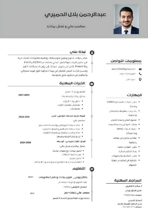 محلل بيانات ومالي أساعد الشركات على تحويل البيانات الى قرارات ذكية باستخدام Excel وPython، مع التركيز على النتائج العملية. جاهز للعمل على مشروع تجريبي بسيط لاثبات مهاراتي
