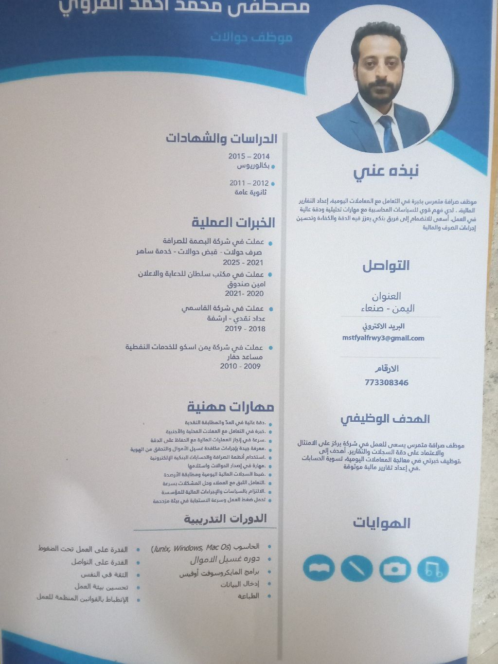 الاسم مصطفى محمد أحمد الفروي. موظف صرافة متمكن وخبير في التعامل مع المعاملات المالية اليومية واعداد التقارير، يتمتع بمهارات تحليلية ودقة عالية. يسعى للانضمام الى فريق بنكي لتوظيف خبرته في معالجة المعاملات، تسوية الحسابات، وضمان الامتثال المالي