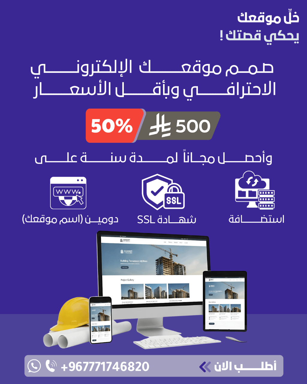 خصم 50% الآن يمكنك تصميم موقعك الالكتروني التعريفي في أي مكان بالعالم ب 500 ريال سعودي فقط مع استضافة قوية لمدة سنة وشهادة SSL لتأمين الموقع ودومين مجاني (رابط الموقع) لمدة سنة
